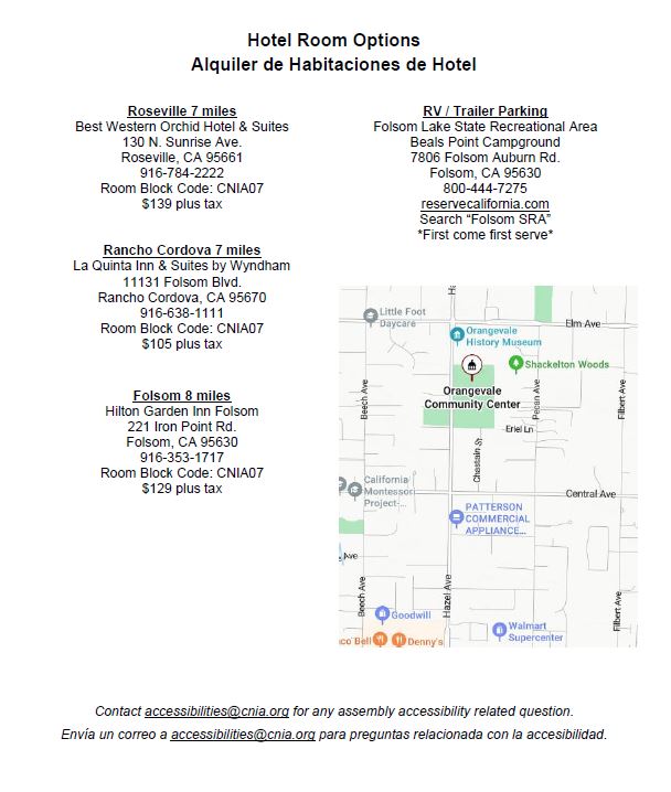 Room blocks are available at the following hotels for Friday 11/14 and Saturday 11/15. All hotels must be booked by calling the hotel directly and requesting the CNIA room rate. Hotels must be booked by October 22, 2025