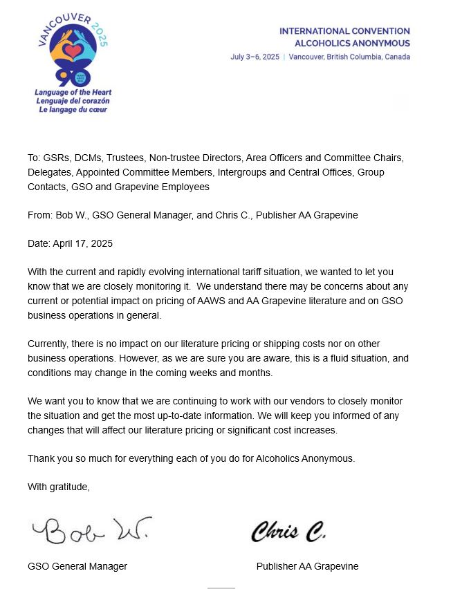 GSO ANNOUNCEMENT RE: TARIFFS AND LITERATURE PRICES April 2025