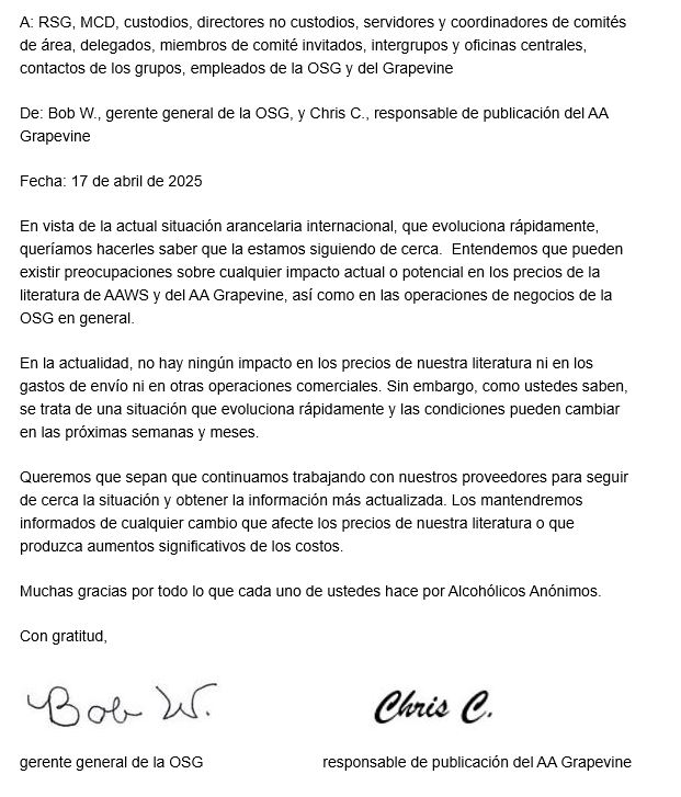 Letter from Bob W General Service Office Manager June 2024 - Spanish