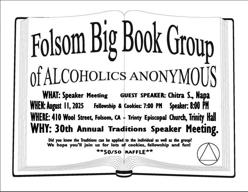 Folsom Big Book Group is having our 30th Annual Traditions Speaker Meeting on August 11th.